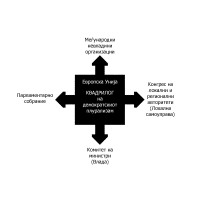 -Развојот и засилувањето на соработката помеѓу МНВО и Комитетот на министри (и неговите тела), како и Парламентарното собрание и Конгресот на локалните и регионалните авторитети од Европа, доведоа до создавање „Квадрилог“ кој во Советот на Европа е израз на демократскиот плурализам и основен елемент за натамошен развој на граѓанска Европа.